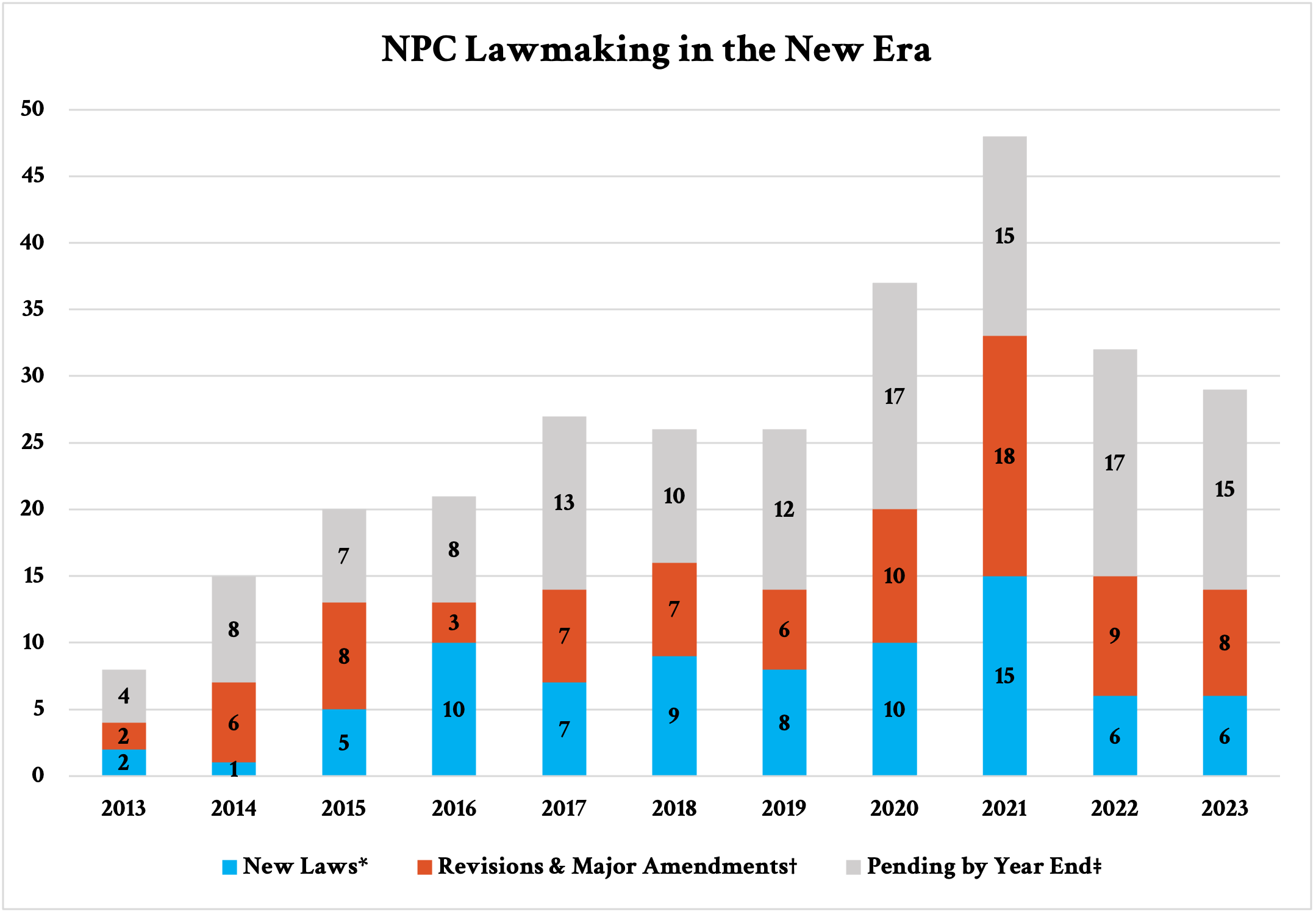 That said, the legislature produced an impressive legislative output in 2023—especially considering it was the first year of its term. Altogether, the NPC and its Standing Committee enacted 6 new laws, approved major changes to 8 laws, and adopted 8 quasi-legislative decisions. An additional 15 bills are pending as of today. For details, please see the lists at the end of this section. [The lists are omitted because Substack says this post would otherwise be too long for email. Check out the original version here.]